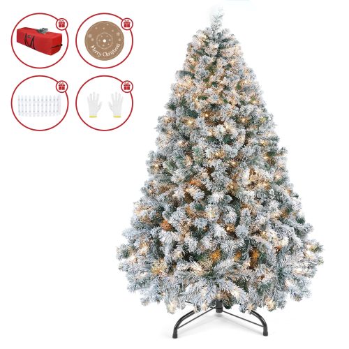 VAVSEA 7.5FT Artificial Christmas Tree, Pre-Lit Snow Flocked Xmas Tree with Storage Bag and Christmas tree skirt Christmas Fence, 350 Warm White Lights, 1200 Tips